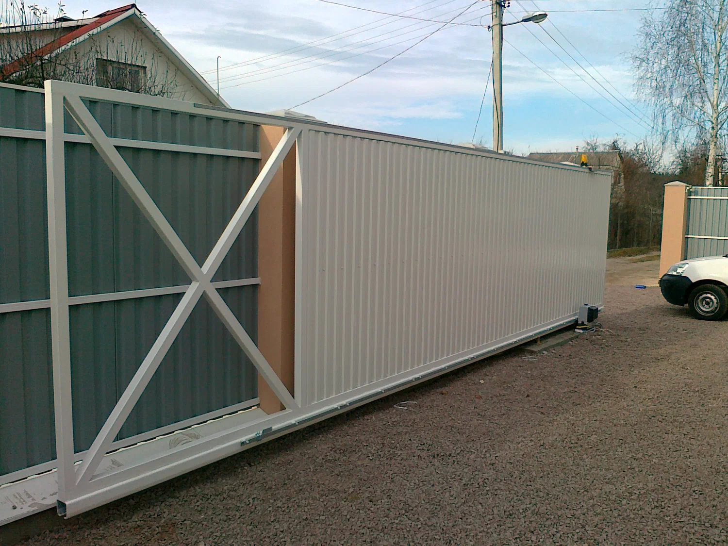 Откатные ворота из профнастила с встроенной калиткой и автоматикой
